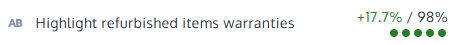 Research indicated that shoppers had concerns regarding the quality of refurbished IT equipment. While the brand only sold high-quality devices, this was not sufficiently clear on the site. This test highlighted item warranties. The variant increased (CVR) by 17.7% at a 98% confidence level.